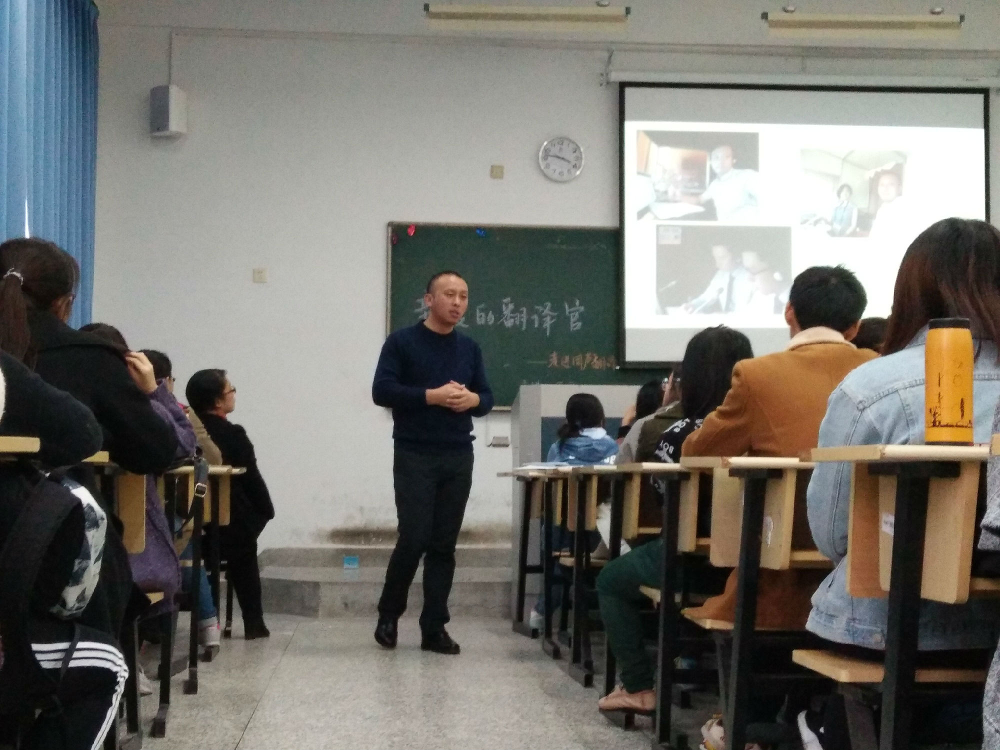 王平老师语言幽默,介绍了从事同声传译的工作经历、工作环境及要求,打破了我们对“高冷”翻译官的印象。他讲述了在工作中遇到的各种事情,列举了许多有趣的实例,就从事同声传译工作所必备的素质与条件进行讲述,使同学们对这一职业有了初步的了解以及浓厚的兴趣。从事同声传译工作对个人能力、脑力、反应力、知识储备等都有非常高的要求,也要学会合作,与搭档在合作中竞争,故能做好这一工作的精英是少之又少。每位翻译官在进行同声传译的过程中都要有搭档,多人轮流翻译,每人翻译15或20分钟一换。在翻译的过程中既要牢记前一句并在4秒左右翻译出,同时也要注意听正在说的内容,在短时间内用地道标准的句子翻译出来,对一些农业、医学等专业方面的翻译要提前熟悉专有名词,对一些读的极快的稿子要跟上速度,对数字这类重要内容要做到零失误零出错,“一心多用”,仿佛同时高速运转三个大脑,压力很大,要求极高。同声传译有挑战性,但具有“4个nice”的优势,是英语精英不二的挑战选择。