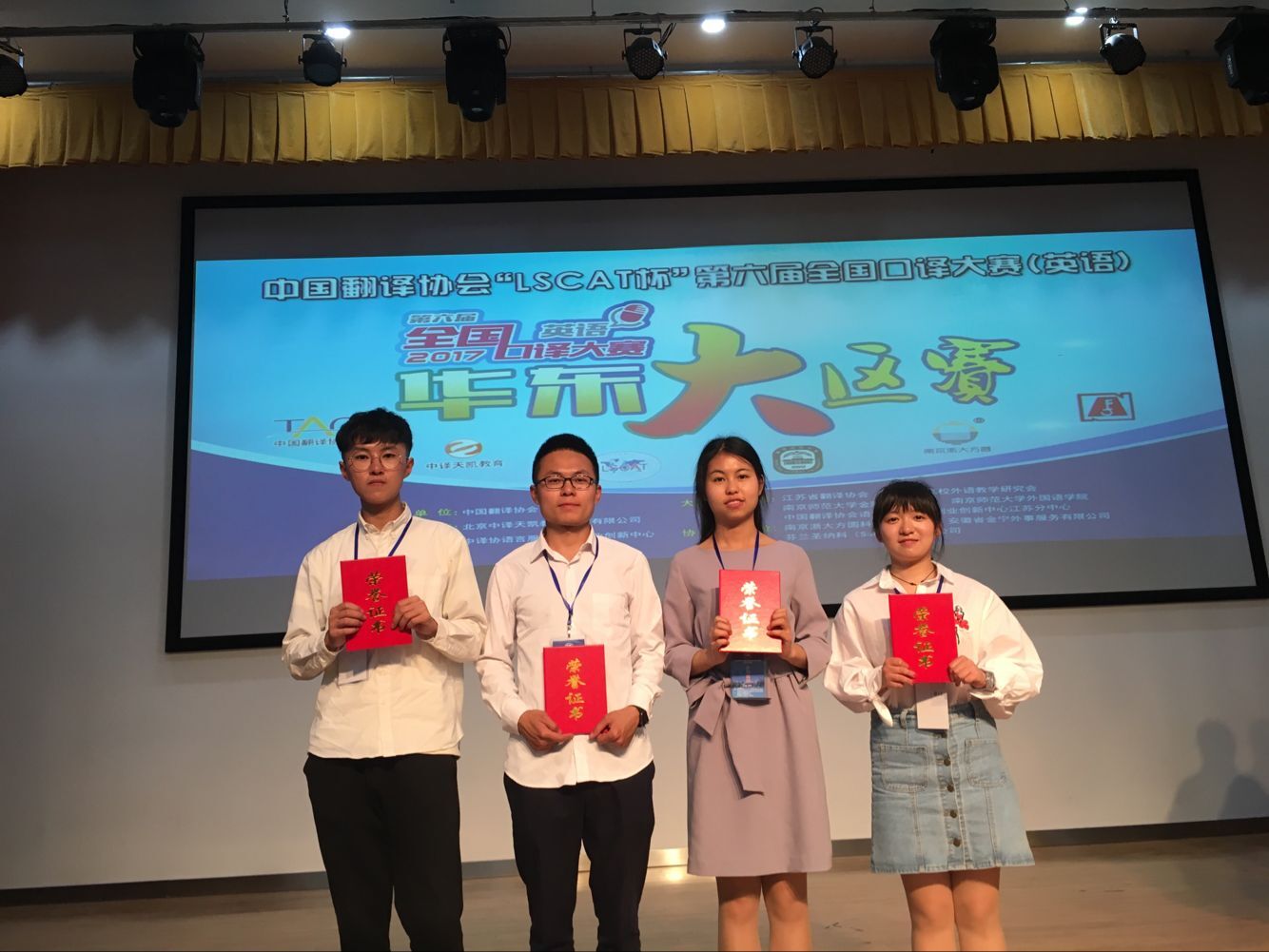 2017年5月13日,中国翻译协会“LSCAT杯”第六届全国口译大赛(英语)华东大区赛在南京师范大学举行。来自江苏、浙江、安徽、山东及上海的68所高校141名各省市复赛晋级选手参加了此次比赛。经过一天的激烈角逐,永利官网英语142班尹自强、翻译141班郭慧、商务英语141班杨昕澄、商务英语141班顾莉娜四位同学均获得三等奖。本次大区赛中有多名来自985、211高校MTI专业的选手。永利官网四位大三的同学与他们同台竞技,以扎实的语言功底和娴熟的口译技能展示了通大学子的风采。此次比赛成果也是全国口译大赛举办六年来永利官网取得的最佳成绩。