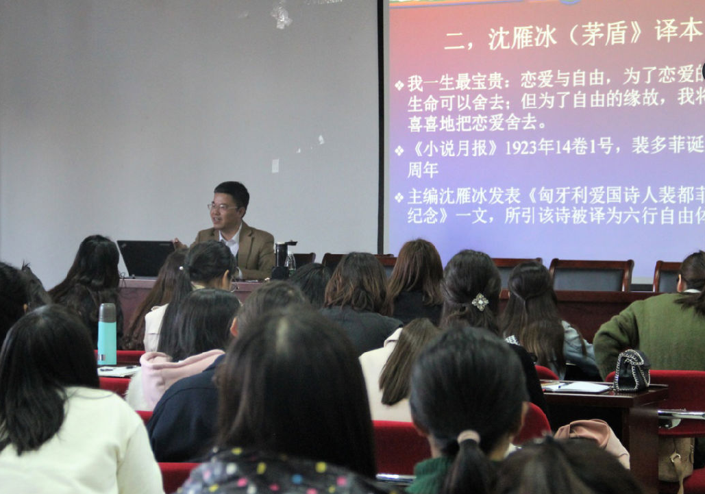 11月9日下午,上海外国语大学宋炳辉教授和李维屏教授应邀为永利官网师生作学术讲座。宋教授作了题为《翻译文学在中国的意义—以裴多菲的一首诗为例》的讲座,宋教授以裴多菲《自由,爱情》一诗的不同中文译本为例,分析了各个中译本所体现的时代意义和核心价值理念,并从译介、传播、影响和接受的角度地阐释了中国文学和外国文学之间的相互交流与传播,并高屋建瓴地讲解了非信息类翻译对译者多方面的素质要求。