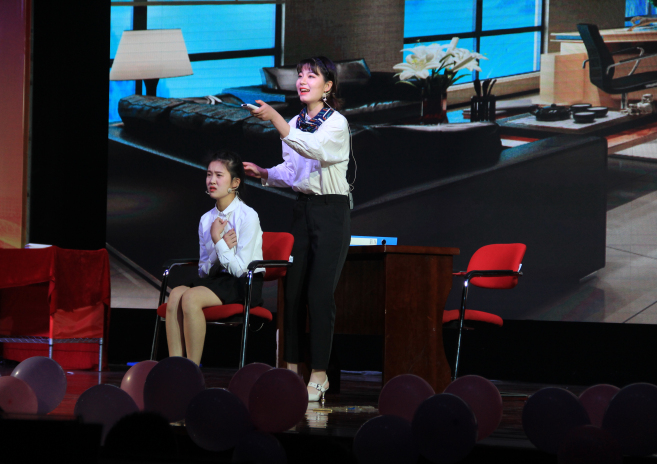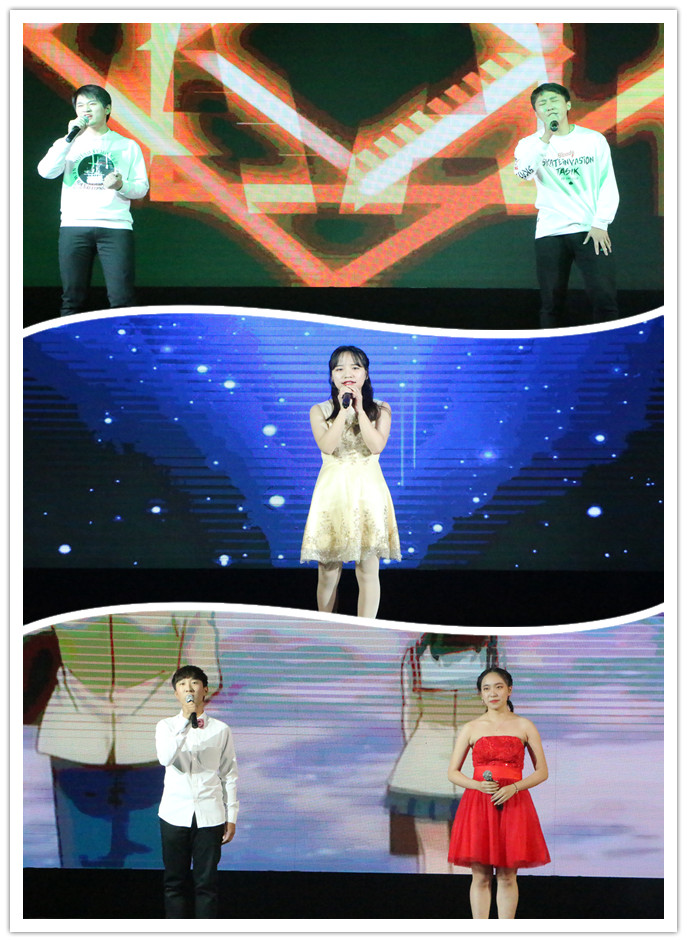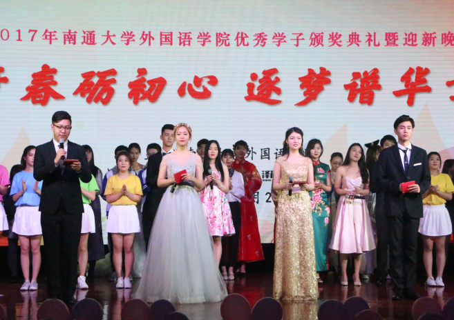 师者,传道受业解惑也。老师们用语言播种,用粉笔耕耘,用汗水浇灌,这是老师对学生无悔的付出。在yl8cc永利官网王建新、李红梅、范琦慧、张煜、姚晶晶五位多才多艺的老师演绎的歌曲串烧《倾心倾听》的歌声中,典礼进入第二篇章——《风华正茂志自强》。尔后,洪欣、赵青的小品《机场培训师》展现了职场人的工作实况,令人捧腹大笑;龚洲岳,张琪琦带来的歌曲《Try Everything》,让大家感受到了年轻与朝气的律动;研究生高贤铭、方文英、倪宁平带来的脱口秀《Magic Chinglish》,为大家展示了日常生活中常见的英文误译,现场笑声不断。第二篇章结束后,永利官网在2017年荣获省、市、校等各级各类荣誉称号的个人和先进集体代表上台领奖。获奖代表本科生徐玲燕同学、研究生宋超同学在接受现场采访中,与大家分享了他们的成长经历与学习经验,并向学弟学妹提出建议,他们感谢外院老师们长期以来对他们的栽培,表示日后会心怀感恩,不断努力,为学院增光添彩。