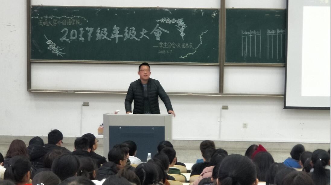 2017级年级大会上,17级年级主任夏光祥老师首先向学生宣讲了今年两会期间政府工作报告的重要内容,引导学生积极关注时事政治;紧接着,夏老师对新生进入大学之后的首次期末考试成绩进行了分析和梳理,对各专业最高分获得者进行了通报;最后,夏老师对近期补(缓)考、重修报名、计算机等级考试等工作进行了说明安排,对近期部分同学旷课等违纪现象进行了严厉批评,并对学生管理的各项制度进行了强调说明。