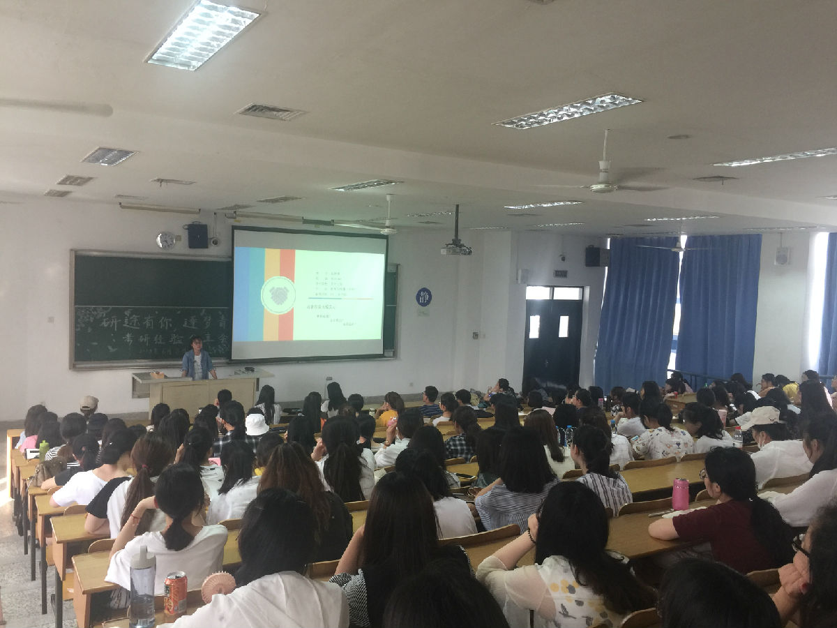 六位刚经历过考研洗礼的学姐、学长为同学们做了最好的榜样,起到了良好的引领作用。张婷婷和戴忠云作为跨考代表,从跨考的注意事项,院校选择和信息收集等方面为大家提供建议。李雯琦以自身经历分享了考研过程中的点滴,主要以备考过程中涉及的备考用书和参考资料为基础,讲解如何有效备考笔译,要搜集并整理理想院校的学制学费、招生人数、报录比、分数线、历年真题,结合自身能力从而确定学校,学会合理规划时间。姬珊和黄佳伟作为英语语言文学方向的考研代表,进行了分享。姬珊选择的二外是日语,她以日语全国统考作为重点展开阐述。黄佳伟以考研心态为切入点,告诫大家切忌妄自菲薄、好高骛远。选择学校要实事求是,但也要能冲就冲,考研复习要紧密结合真题,并着重提到了英美文学方向复试的注意点:多听学术讲座,关注导师的研究方向以及自我介绍要有一定的引导性。张弛作为出国留学学生的代表,与同学们分享了申请国外学校的一些注意点和常识,如GPA的算法、PS、CV以及推荐信等等。