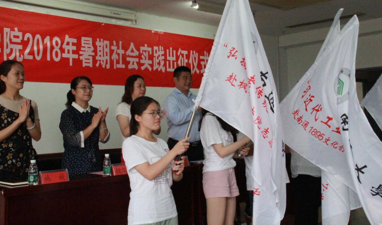 7月4日下午,yl8cc永利官网举行2018年大学生暑期社会实践出征仪式。yl8cc永利官网党委书记施皓,党委副书记、副院长陈俊怀以及全体辅导员出席仪式,并为社会实践重点团队代表授旗。