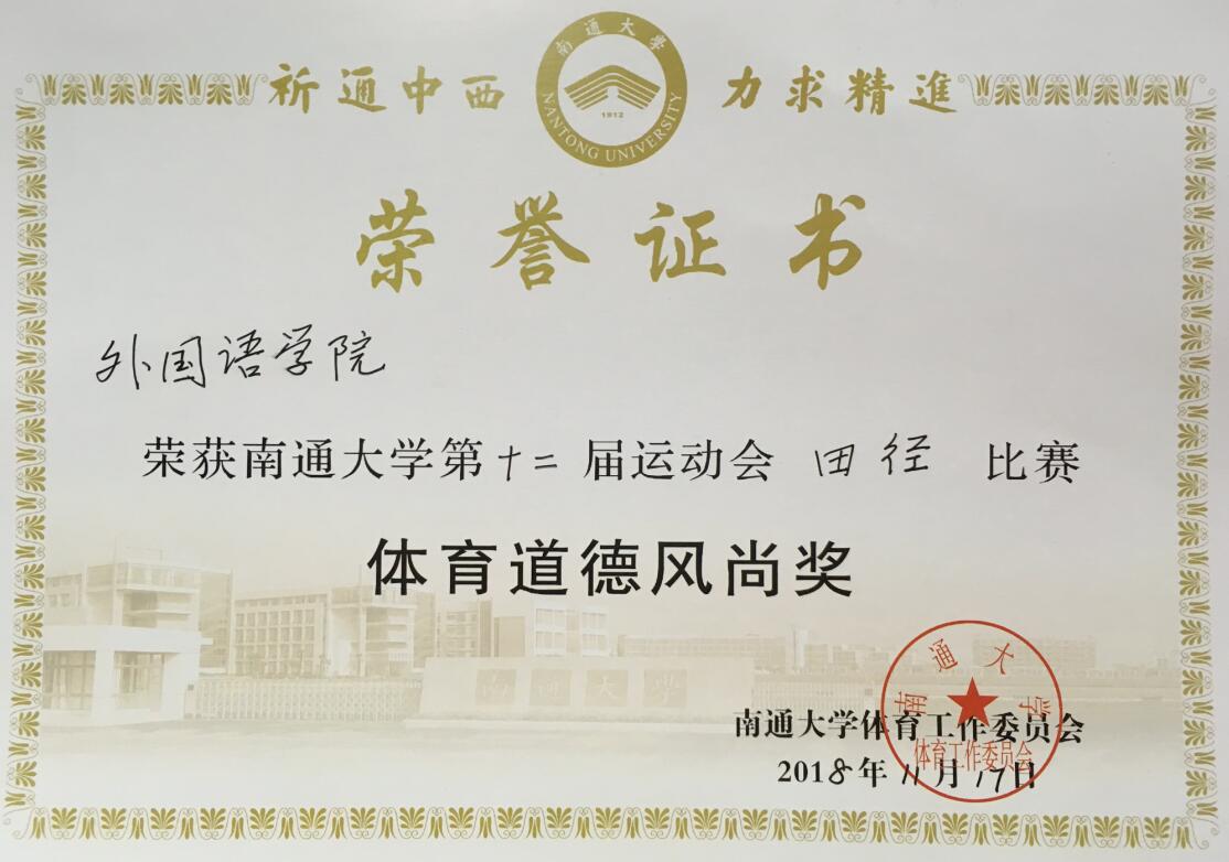 经过两天的激烈角逐,外院运动健儿大展风采,捷报频传。章紫琳同学荣获女子标枪第四名和女子铁饼第六名;陈心如同学荣获女子跳高第四名;由宋申甲、王馨钰、韦婧、李玺诺四位同学荣获女子4*100团体第四名;唐志超同学荣获男子铅球第六名;费晨烊同学荣获男子200米第7名。除个人奖项之外,永利官网还以勇于拼搏的斗志,高尚的体育道德和严谨的秩序斩获“体育道德风尚奖”。