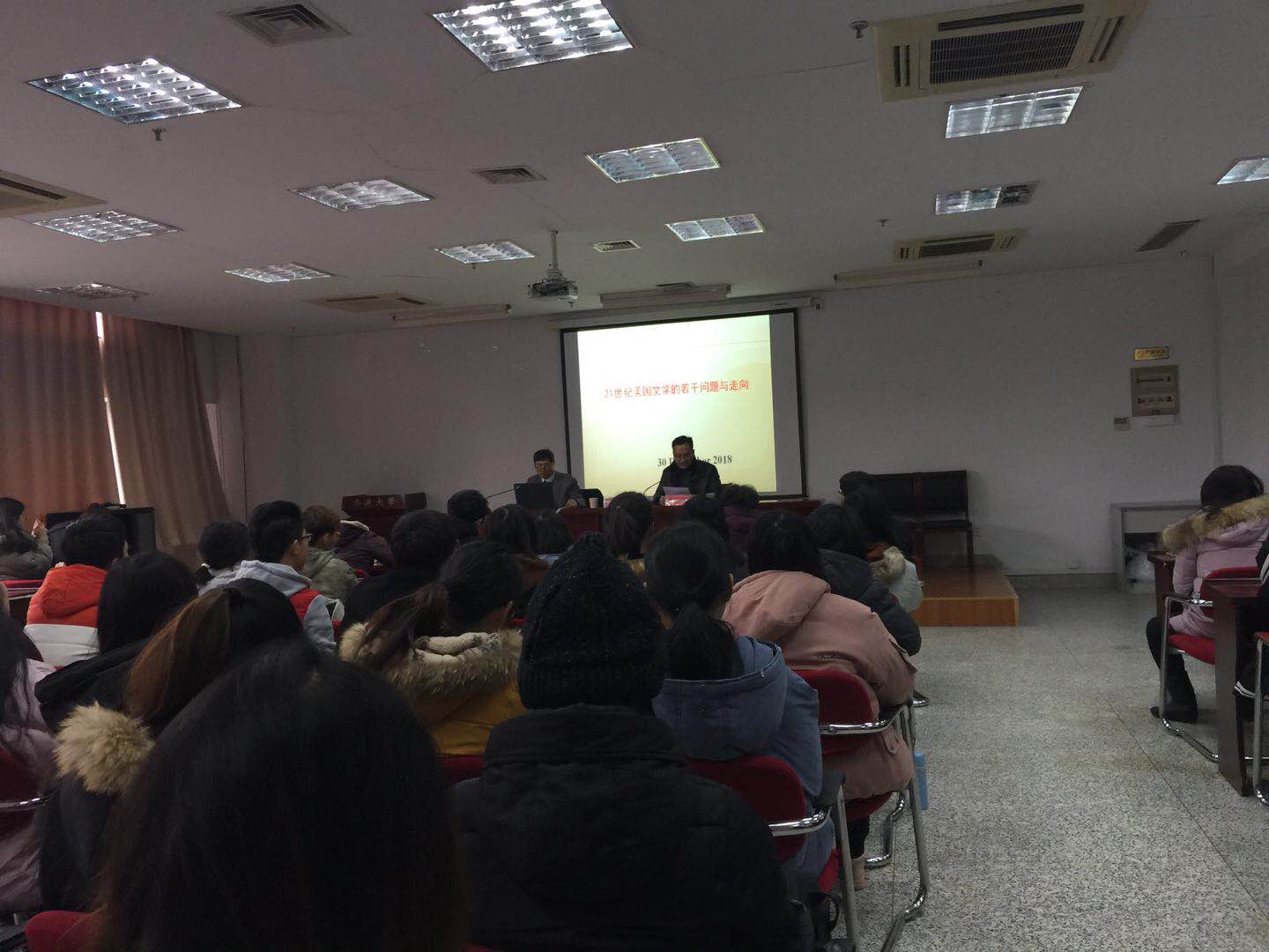2018年12月30日下午,南京大学yl8cc永利官网院长、博士生导师、《当代外国文学》主编杨金才教授来我校江海高层论坛作“21世纪美国文学的若干问题与走向”的学术报告。