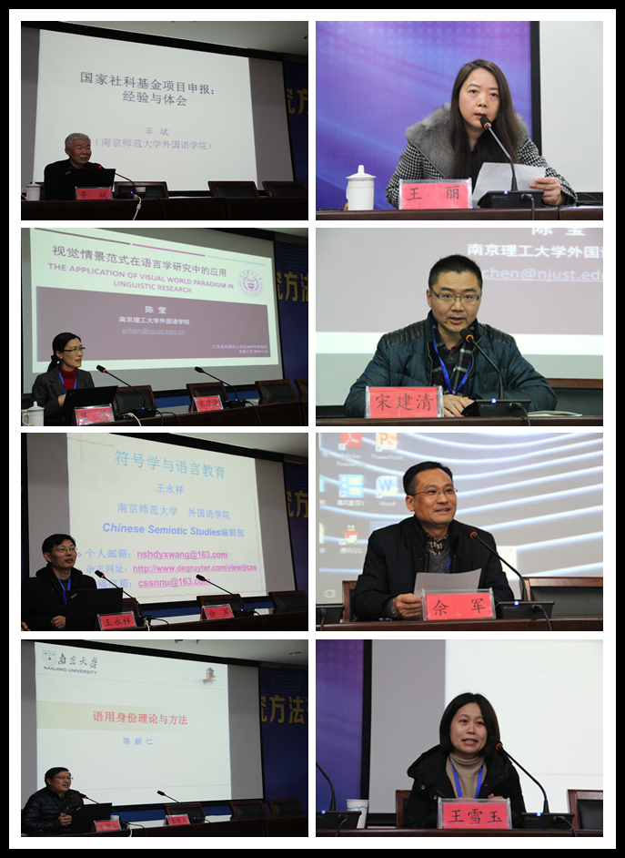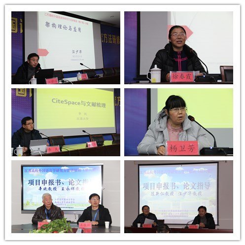 开幕式后,南京师范大学辛斌、王永祥、汪少华教授、南京理工大学陈莹教授、南京大学陈新仁教授、江苏大学李民博士作六场主旨报告,分别围绕“项目选题与申报书撰写”“学术论文写作与投稿”“架构理论应用”“视觉情景范式在语言研究中的运用”“语用身份理论与应用”“Citespace在学科综述中的运用”等主题进行深入讲解。研修期间,辛斌、王永祥、陈新仁、汪少华还就“项目申报书、论文指导”专题进行分组研讨,就国家社科项目申报中存在的问题对青年教师进行指导,现场互动积极,气氛热烈。