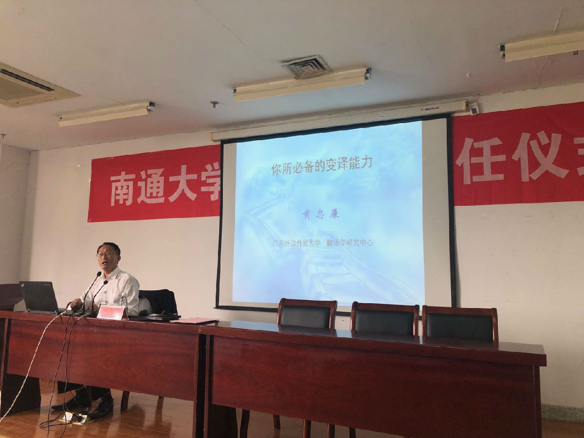 聘任仪式后,黄忠廉教授作了题为“你所必备的变译能力”的学术报告,阐述了他自2002年开始构建的变译论,并以易经八卦构架为例简明扼要讲解“一个核心、两个矛盾、四个要素、八个策略和十二个方法”。他结合翻译实践实例,指出生活中处处有变译,且相对于全译而言,变译对译员的要求更高。他强调翻译研究不能只关注结果不注重过程,需要回归本体。