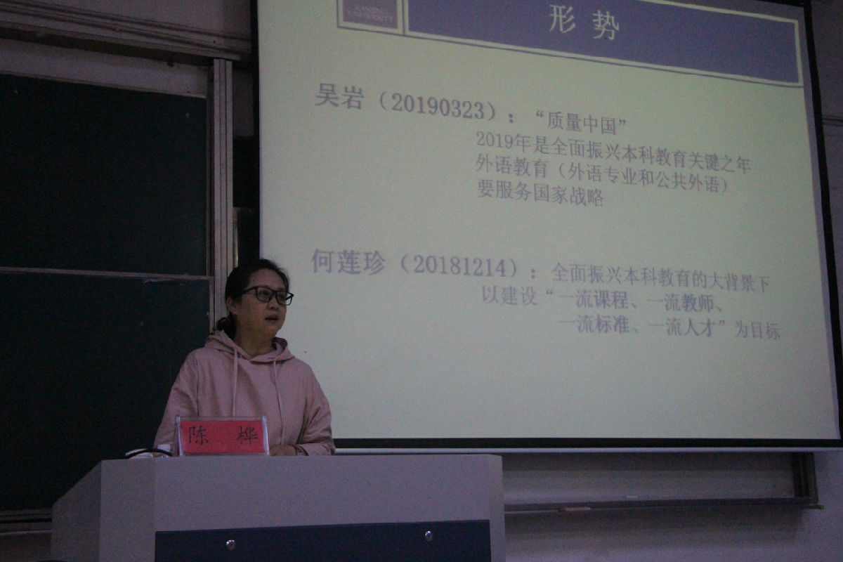 5月29日下午,南京大学大学外语部主任、外国语言学及应用语言学专业博士生导师陈桦教授应邀来我校yl8cc永利官网大学外语部做了题为“个性化教学体系的构建与实施”的报告。报告会由yl8cc永利官网副院长徐托主持。大学英语教学部全体教师到会聆听了报告。