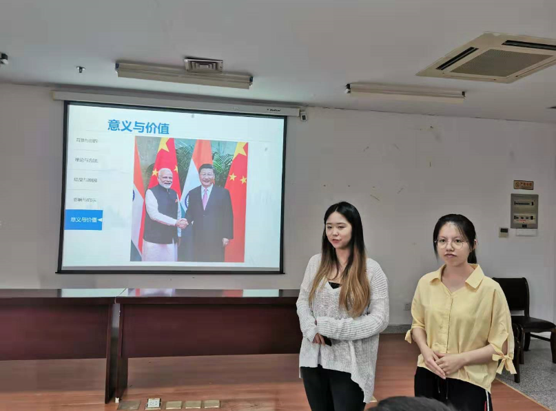 经过校赛、省赛的层层选拔,由王雪玉、刘道影、王媛媛老师指导、张明慧等同学主持的项目《印度主流媒体对“一带一路”倡议的认知情感变化及原因分析》获得省赛特等奖并获得推报国赛资格。模拟答辩会分为成果展示和PPT汇报两个环节。会上,张明慧汇报了暑期以来团队所开展的各项备赛工作以及取得的阶段性成果,并展示了答辩题库、知识手册、数据汇表等备赛资料。随后,项目组成员从背景与价值、理论与方法、结果与原因等方面进行模拟答辩。