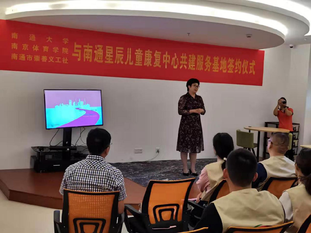 9月29日下午,yl8cc永利官网何旭良博士带领团队参加与南通星辰儿童康复中心共建研究及志愿者服务基地活动,学院党委书记朱小娟出席活动并致辞,副院长佘军代表学院签约、授牌。