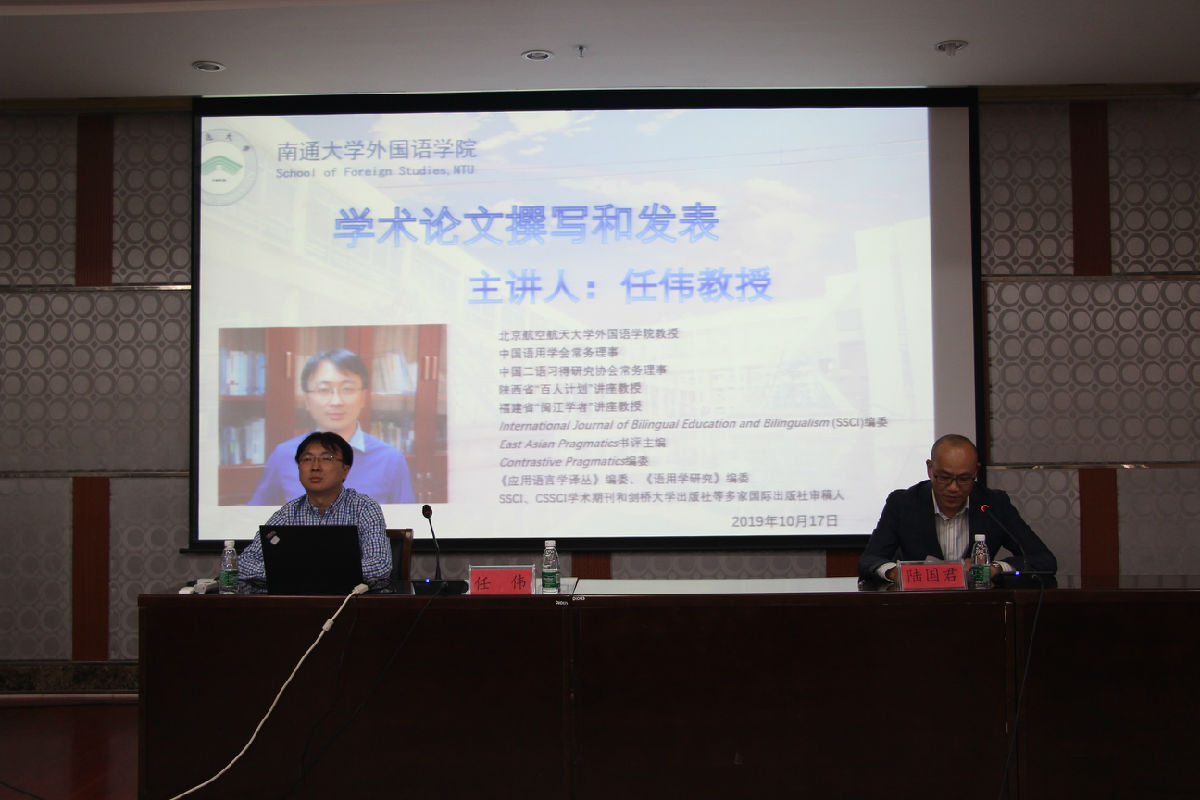 任教授从近几年国内外发表论文的困难入手,首先介绍了国内外期刊发表学术论文的途径和种类。他指出,研究者应结合自己的实际情况,做出自己的选择;鼓励大家多写原创性的科研论文。任教授重点阐述论文写作的三个核心:选题重要性、社会需求及学术需求。他以自己发表在SSCI期刊上系列论文为例,说明如何从日常生活及教学中发掘高质量论文选题,让选题具有研究的后续性;结合现有学术文献,收集语料或数据,撰写高质量论文在国内外权威期刊上发表。任教授的学术报告细致入微,内容丰富,大到论文选题、论文创新,小到Endnote软件的运用、投稿技巧,让与会者收益匪浅。