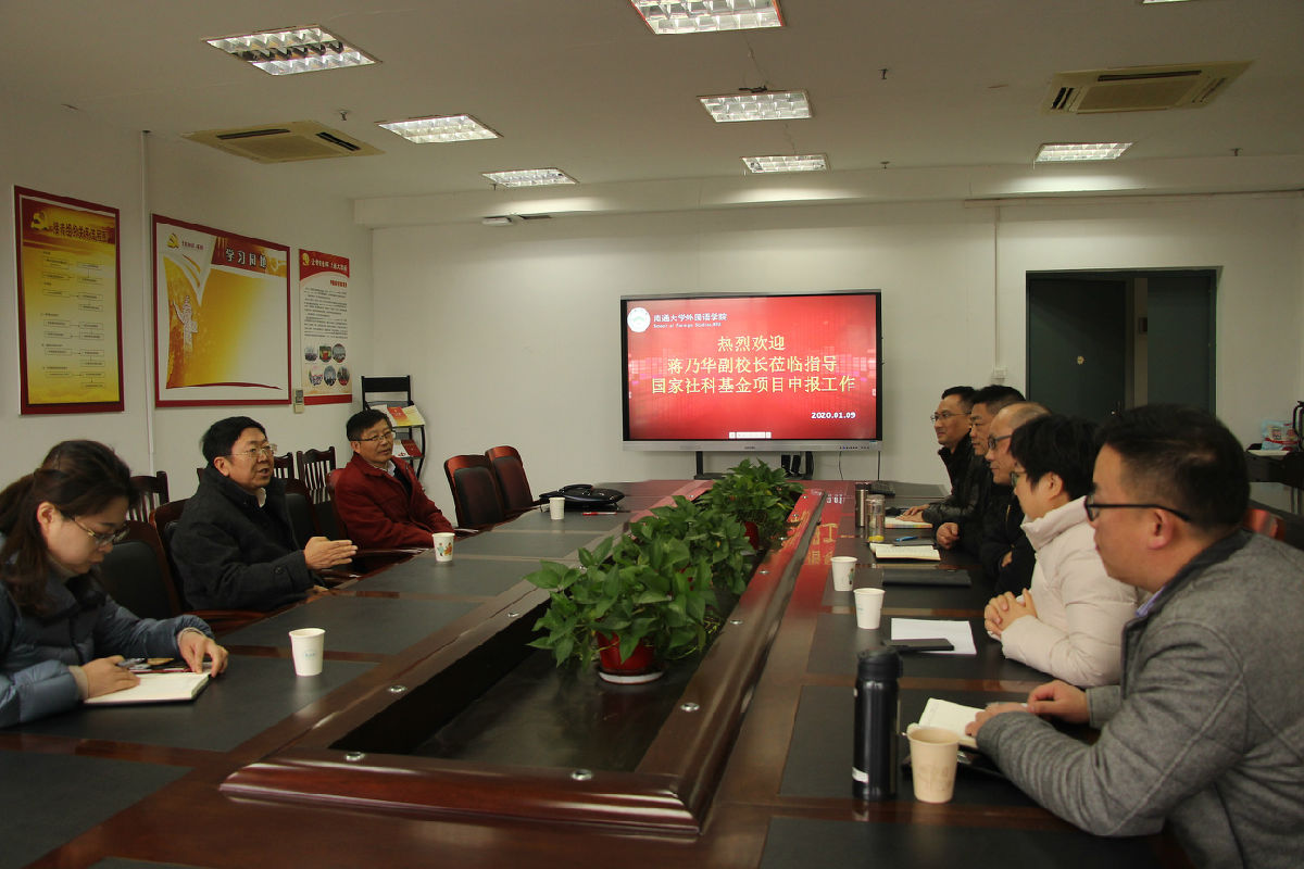 1月9日下午,蒋乃华副校长和人文社科处丁卫泽处长一行来永利官网指导2020年国家社科基金项目申报工作。学院领导班子全体成员出席汇报会。陆国君院长介绍了学院2020年国家社科基金项目申报工作的整体部署。佘军副院长就国家社科基金项目申报工作的具体安排情况作了汇报。