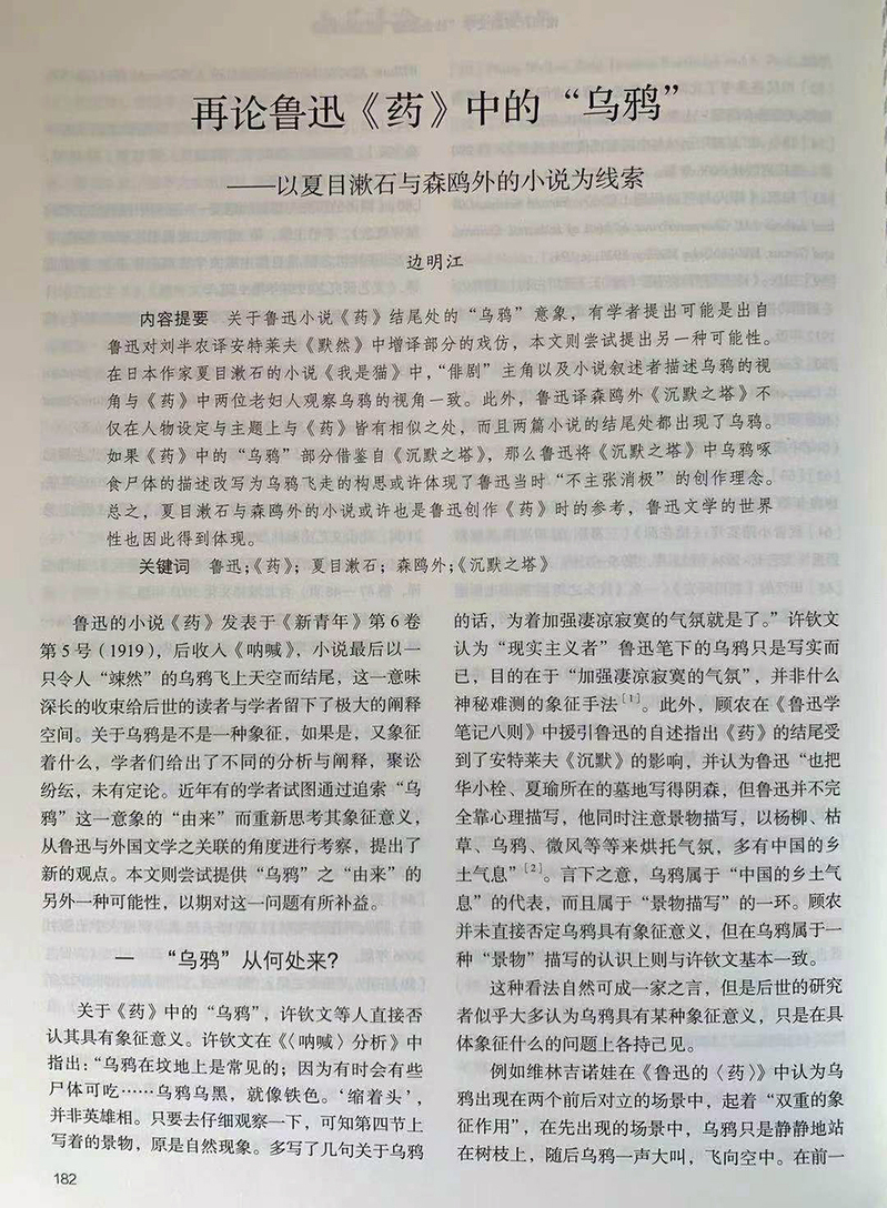 近日,永利官网日语系青年教师边明江博士撰写的论文《再论鲁迅<药>中的“乌鸦”——以夏目漱石与森鸥外的小说为线索》,在中国文学研究领域最权威期刊《文学评论》2020年第6期上发表。