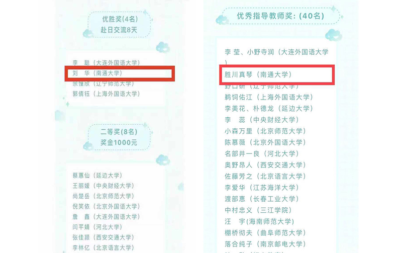 据悉,本次大赛共有来自全国207所中高等院校和社会各界日语爱好者的投稿1815篇,最终评审出优胜奖4名、二等奖8名、三等奖30名、优秀奖40名。15所大学获得最佳组织奖,40名教师获得优秀指导教师奖。优胜奖获得者将受日本科学协会的邀请,于2021年访问日本8天,与日本青年进行交流和社会体验,进一步加深两国间青年的文化交流与人文交流。