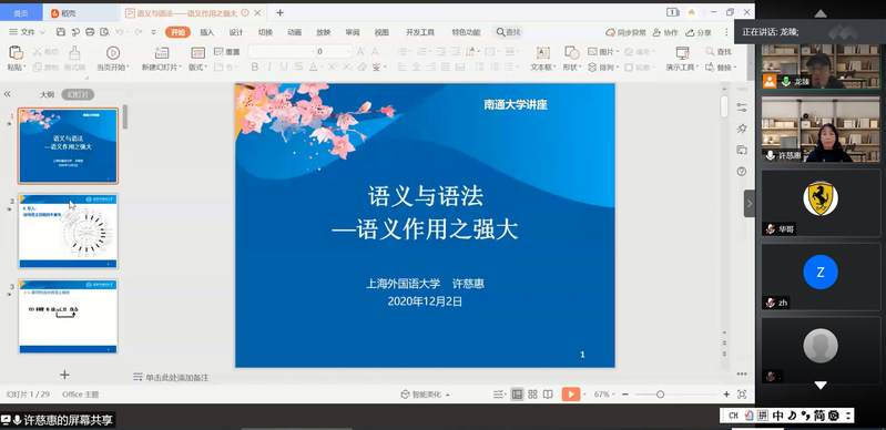 12月2日下午,上海外国语大学博士生导师许慈惠教授应邀为日语系全体师生作了题为“语义与语法——语义作用之强大”的线上学术讲座。讲座由yl8cc永利官网日语系主任龙臻主持,日语系教师、全体本科生和研究生参加了讲座。