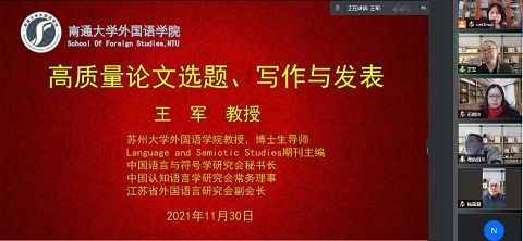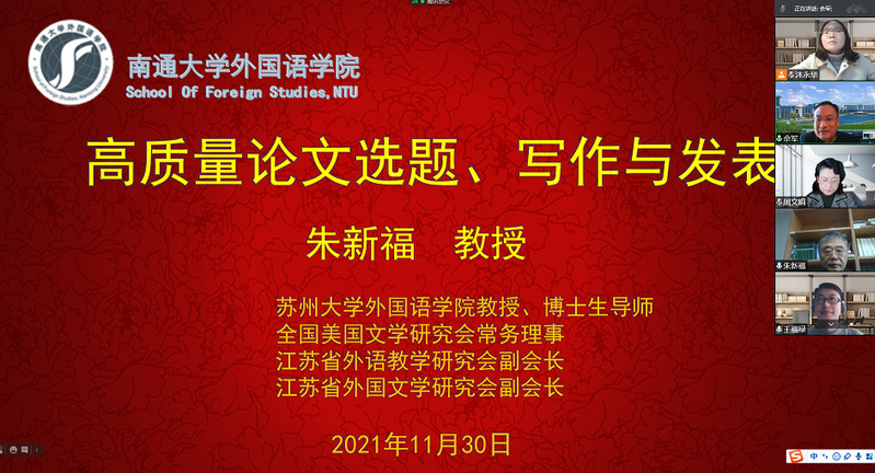 11月30日下午,yl8cc永利官网举办第四期高质量学术论文写作工作坊。苏州大学博士生导师朱新福教授和王军教授受邀分别担任文学组和语言学组工作坊特邀点评专家。