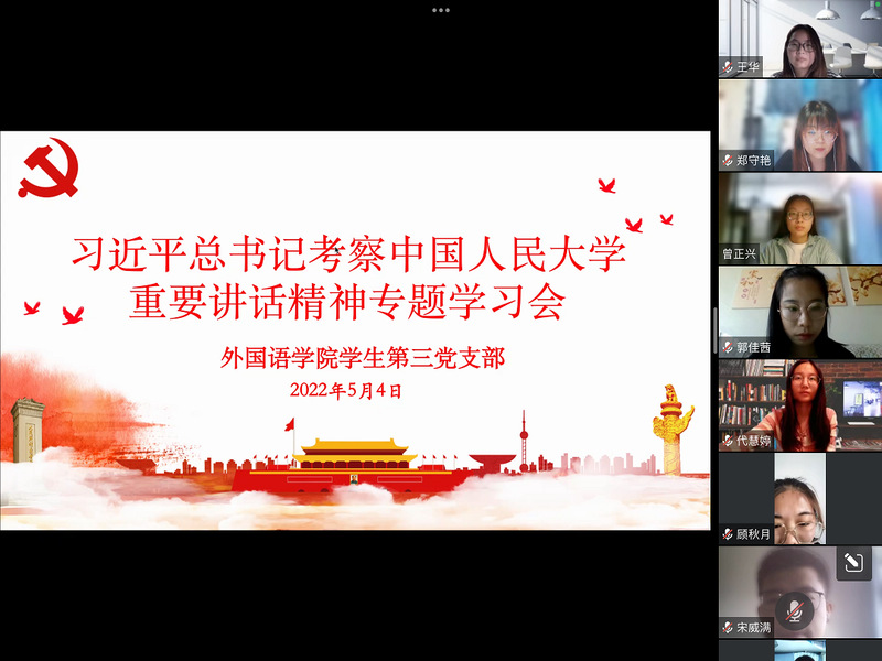 5月3日下午,yl8cc永利官网学生第三党支部通过腾讯会议举行专题学习会,学习习近平总书记4月25日在中国人民大学考察时的重要讲话精神。