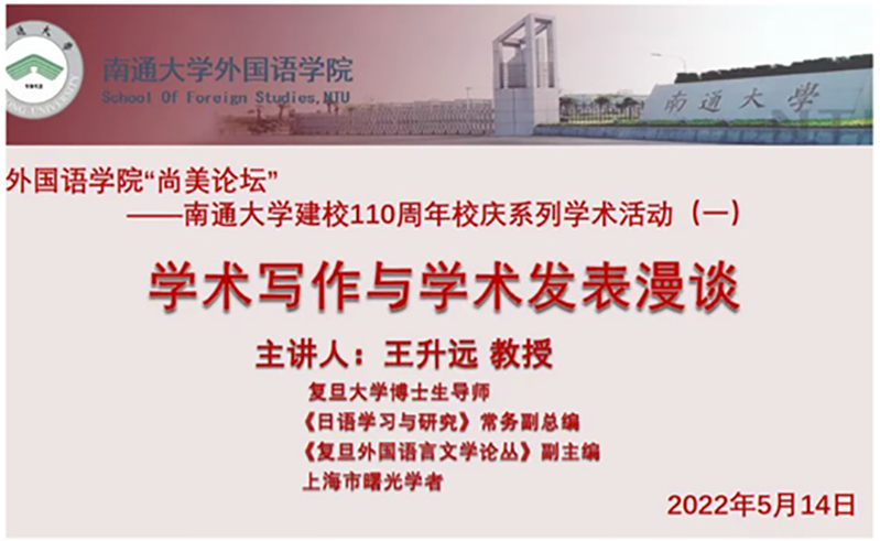 5月14日晚,yl8cc永利官网“尚美论坛”学术讲座开讲。首场讲座邀请复旦大学博士生导师、《日语学习与研究》常务副总编、《复旦外国语言文学论丛》副主编王升远担任嘉宾。