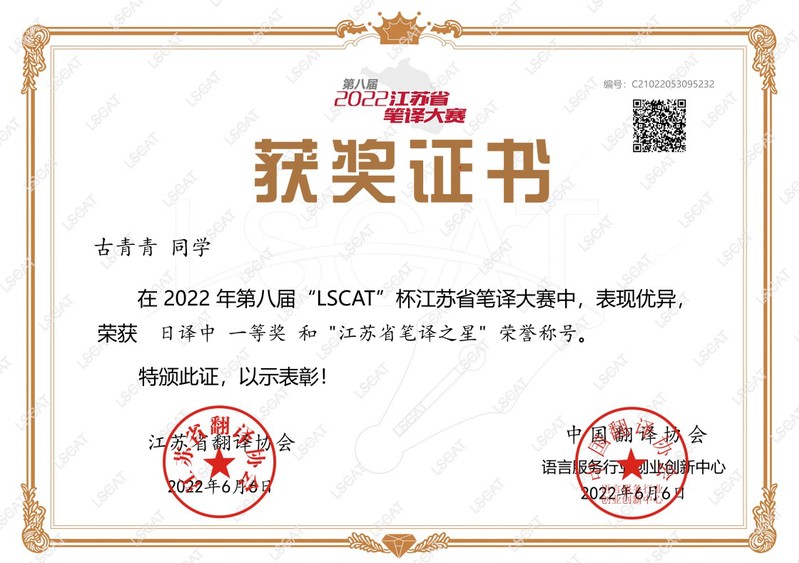 近日,2022年第八届“LSCAT”杯江苏省笔译大赛结果揭晓。yl8cc永利官网日语系学子再创佳绩,获“江苏省笔译之星”1项、一等奖6项、二等奖14项、三等奖15项、优胜奖16项。其中,日语201班古青青同学荣获日译汉组一等奖和“江苏省笔译之星”称号。