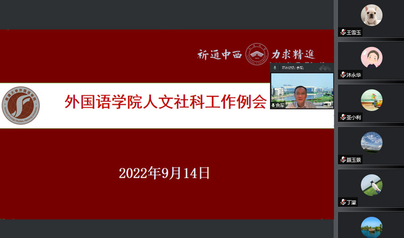 学院副院长佘军传达了学校人文社科工作会议精神,总结学院上半年人文社科工作完成情况及暑期重点工作,分析学院科研工作存在的主要问题,并部署了学院下半年科研重点工作。他强调,在学校奋力建设特色鲜明高水平大学的冲刺期,学院的科研工作务必紧密围绕学院事业发展的“十四五”规划目标科学有序地进行开展。他勉励学院教师,一要学懂弄通上级文件精神和学校要求,针对外语学科研究前沿热点问题,开展与国家需求相关的科研工作;二要深化理解科研组织化工作的内涵,对接学院在研国家社科基金项目和省部级科研项目,充分利用现有科研平台齐心协力开展高质量科研工作,凝练学院科研工作特色;三要沉下心来做有深度的外语学科科研工作,融通中外,讲好中国故事,做好高水平科研成果的增量工作;四要坚持不懈抓好科研人才队伍建设工作,力促科研人才队伍建设出成效,做好做足科研项目申报的存量工作;五要广泛开展学术交流,增强学术自信,积极申报省级以上科研创新平台和人才工程项目,做好学院外语学科科研成果的宣传工作,为学院的学科建设奠定坚实基础。