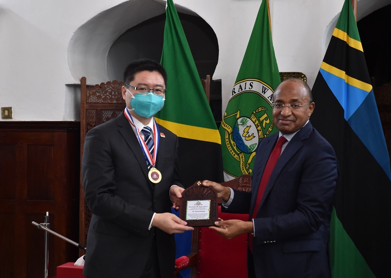 2022年9月10日恰逢中国的中秋节,坦桑尼亚桑给巴尔总统姆维尼接见了第31期中国援桑给巴尔医疗队,并代表卫生部向宋建清颁授奖章和证书,以表彰他为促进桑给巴尔卫生事业和中桑友谊所作出的贡献。桑卫生部马兹伊部长特意亲笔签署了感谢信,感谢我校派出优秀翻译,为桑给巴尔的卫生和公共事业发展提供了有力支持。