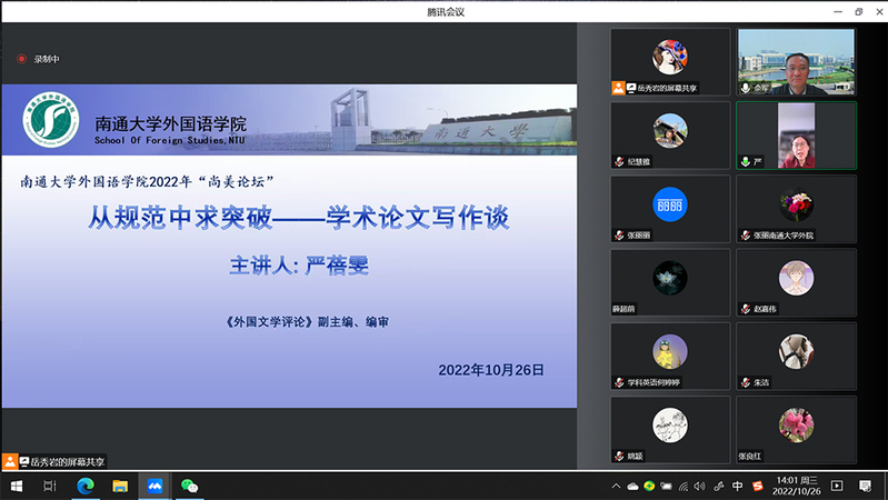 10月26日下午,中国社科院外文所《外国文学评论》副主编严蓓雯应邀做客yl8cc永利官网“尚美论坛”,并作“从规范中求突破——学术论文写作谈”的专题讲座。
