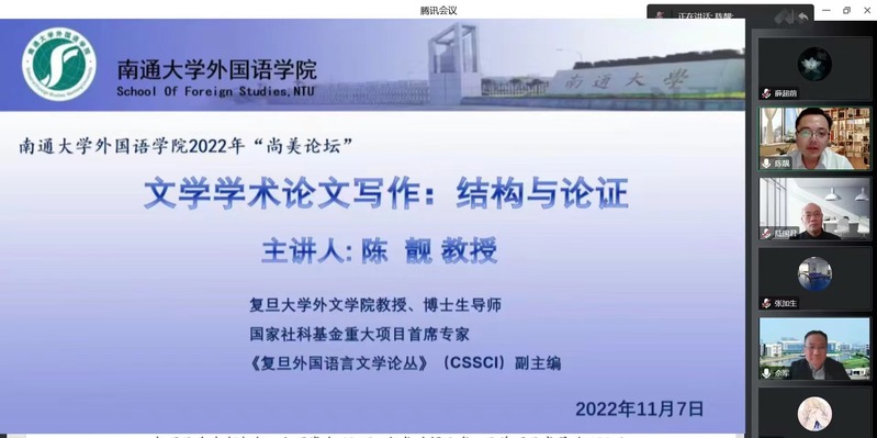 11月7日下午,国家社科基金重大项目首席专家、复旦大学外文学院教授、博士生导师、英文系主任、《复旦外国语言文学论丛》(CSSCI)副主编陈靓应邀做客yl8cc永利官网yl8cc永利官网“尚美论坛”,并作“文学学术论文写作:结构与论证”的专题讲座。