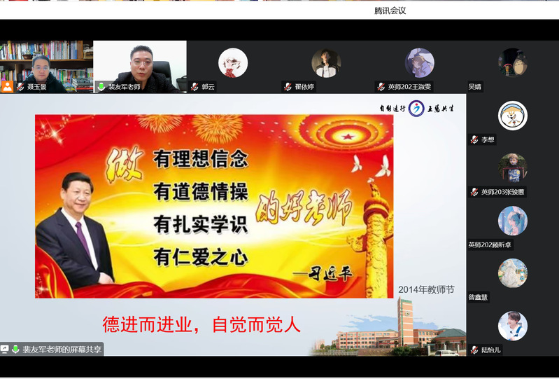 为了让英语师范生近距离、深层次接触基础教育教学实际,11月22日晚,yl8cc永利官网邀请如皋市实验初中校长裴友军,在云端为2020级英语师范全体学生作题为“幸福教师修炼手册”的专题讲座。裴校长围绕结合“四有好老师”的要求,从职业观、教育观和学生观三个角度,引用古今中外的优秀教师事例、学生心目中好教师的标准、社会对好教师的期待等进行阐释,接着结合实例介绍如何处理好与学生、家长和同事之间的关系,最后裴校长从阳光之心、责任之心和进取之心三方面概括英语师范生的专业发展要求。