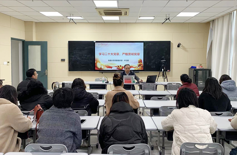 卢志勇以《学习二十大党章 严格贯彻党章》为题,围绕“党章的地位作用和框架结构”“党章修改的背景及考量”“党章修改的主要内容”“贯彻落实新党章的要求”等四个方面进行详细阐述。他深入解读了《中国共产党章程》中的新理论、新观点、新内容,指出新修订的党章体现了马克思主义中国化时代化的新成果,体现了新时代坚持和发展中国特色社会主义的新举措,体现了坚持党的全面领导推进党的建设的新经验。卢志勇对党员教师提出三点要求:一是自觉学习党章、遵守党章、贯彻党章、维护党章,做到思想上更加统一、政治上更加团结、行动上更加一致;二是深刻领悟“两个确立”的决定性意义,增强“四个意识”、坚定“四个自信”、做到“两个维护”;三是自觉加强党性修养,切实把党章各项规定要求落实到具体行动上,在学思践悟中保持共产党员的初心使命。