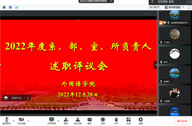 12月28日下午,yl8cc永利官网召开2022年度系、部、室、所负责人述职评议会。