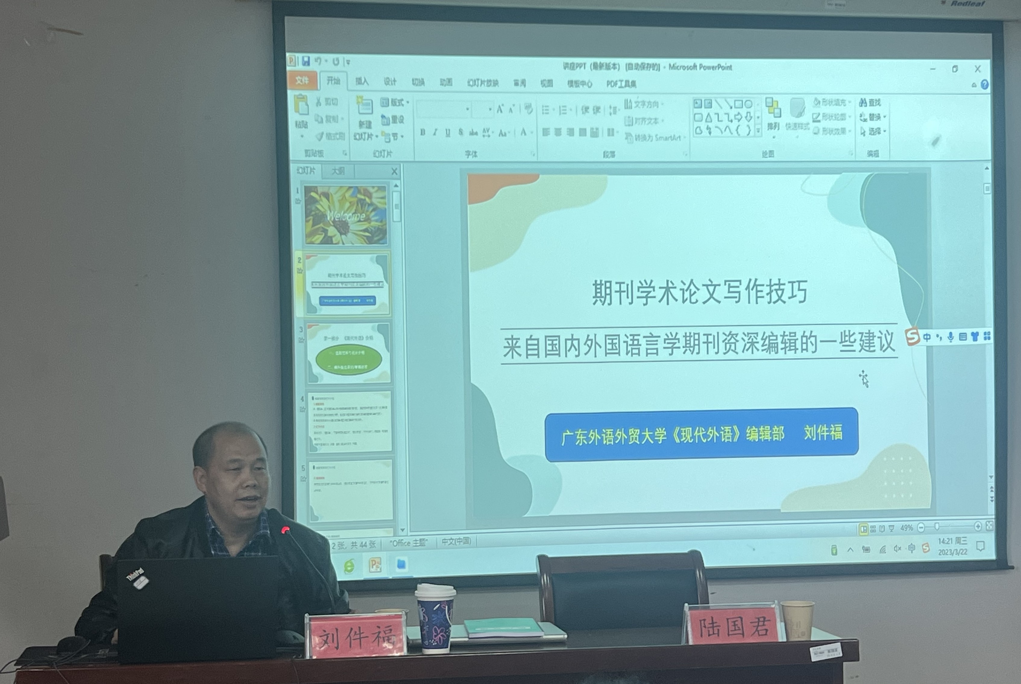 3月22日下午,广东外语外贸大学英语研究员,《现代外语》资深编辑刘件福应邀做客yl8cc永利官网“尚美论坛”,并作“期刊学术论文写作技巧——来自国内国外语言学期刊资深编辑的一些建议”主题讲座。