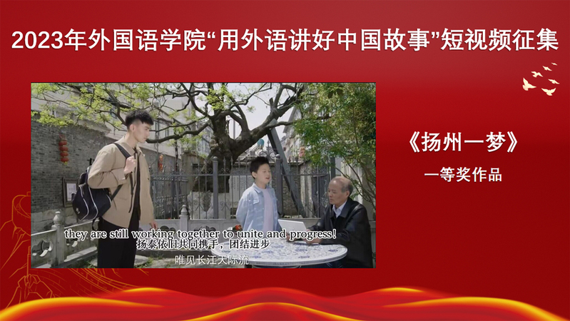 来自英语师范、商务英语、翻译、日语四个专业的学生积极参与活动。大家围绕“大美中国·故乡风韵”主题,运用多元叙事技巧和丰富视听语言,用短视频多维度展现可信、可爱、可敬的中国形象。活动共征得26件作品,经评选,商务英语222班张天佑等三位同学创作的《扬州一梦》获一等奖;英语师范212班严翊菲的作品《南京云锦》和翻译192班王彦雯等四位同学的作品《心安之处》获二等奖;商务英语(合)201班吴佰纯等三位同学的作品《如皋水绘园》、翻译211班郁佳蕾的作品《舌尖美食(马蹄酥)》、英语师范(定向)221班徐石的作品《山水寄情,挚爱家乡》及英语师范223班曹格睿的作品《心中有国,家中有爱》获三等奖。这些优秀作品将通过学院微信公众号进行展示,进一步帮助师生深入学习贯彻党的二十大精神以及习近平总书记给南京大学留学归国青年学者回信中提出的“在坚定文化自信、讲好中国故事上争做表率”的重要指示精神。