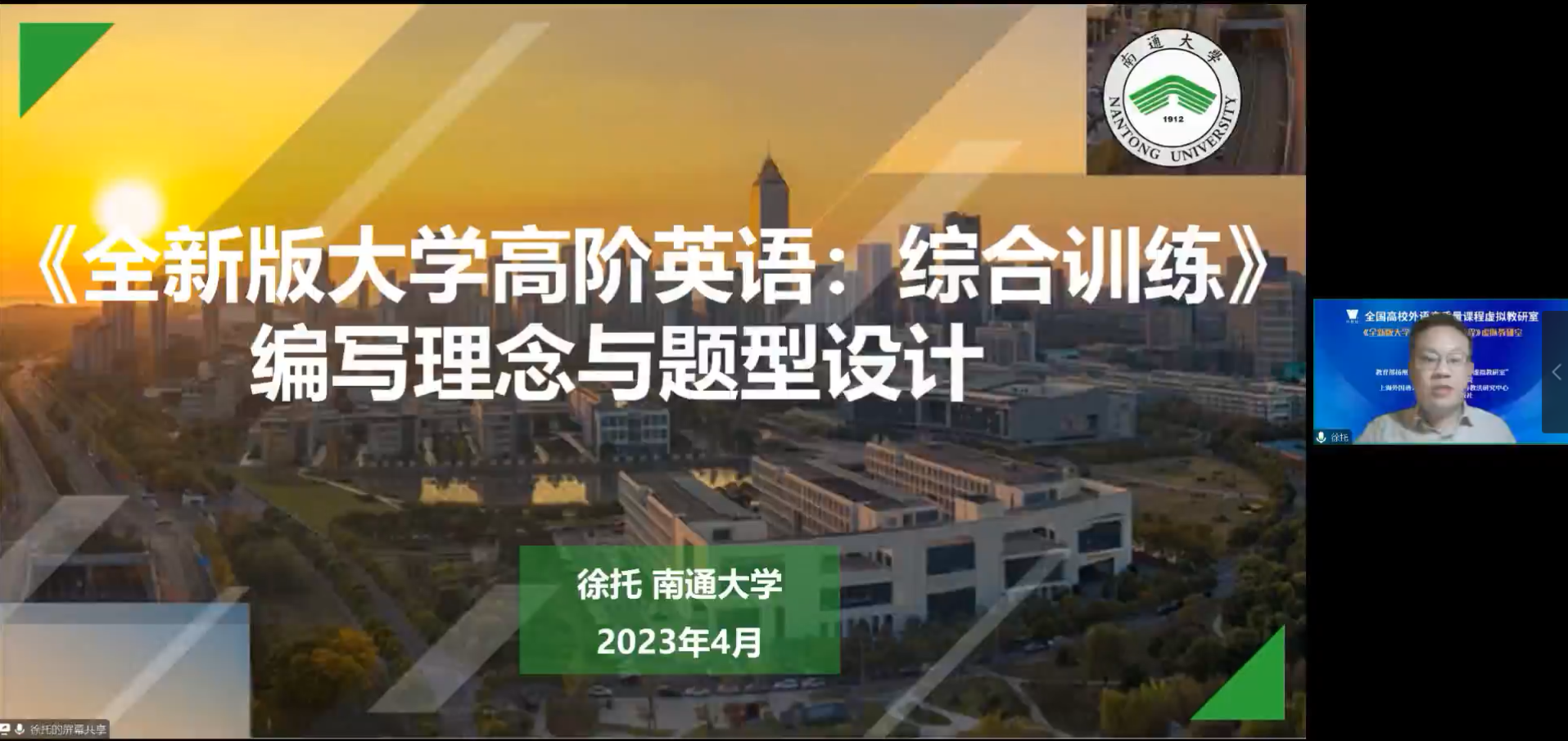 4月29日晚,上海外国语大学中国外语教材与教法研究中心、上海外语教育出版社、教育部扬州大学“大学外语课程群虚拟教研室”、扬州大学yl8cc永利官网联合举办了“全国高校外语高质量课程虚拟教研室”活动。本次活动以“《全新版大学高阶英语综合教程》虚拟教研活动”为主题,我校yl8cc永利官网副院长徐托作为《全新版大学高阶英语综合教程》配套训练的总主编,做了题为“《全新版大学高阶英语综合训练》编写理念与题型设计”的主题报告。