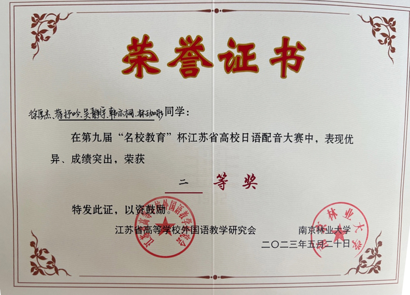 本次大赛由江苏省高校外语教学研究会主办、南京林业大学yl8cc永利官网承办、名校教育集团东京yl8cc永利官网共同协办,比赛吸引了南京师范大学、江南大学、扬州大学等省内23所高校团队参赛。初赛配音环节中,日语系21级、22级学生徐厚杰、蒋抒吟、吴静宇、韩亦桐、林珈彤五名同学生动演绎了日本动漫作品片段,赢得评委一致认可,并进入决赛演讲环节。进入决赛的13支队伍采用随机抽取日本谚语并进行即兴演讲,由一名选手代表参赛。经过两轮比赛的激烈角逐,最终荣获二等奖。